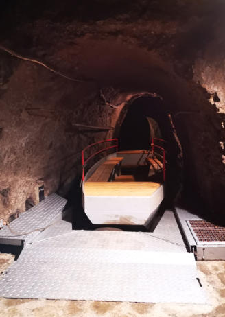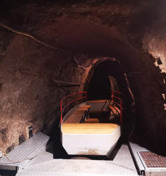 Unser neues Boot an einer der von uns neu gestalteten Anlegestellen unter Tage. Noch sind sie verwaist.Wir erwarten Sie bei der Zulässigkeit der Öffnung:Ostersonntag und Ostermontag 2021 jeweils Einfahrt 10, 13 und 15 Uhr.Nur Anmeldungen per Mail, Führung nur mit persönlichem Mundnasenschutz!